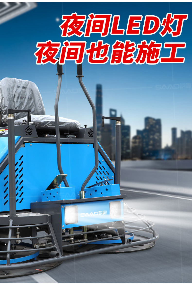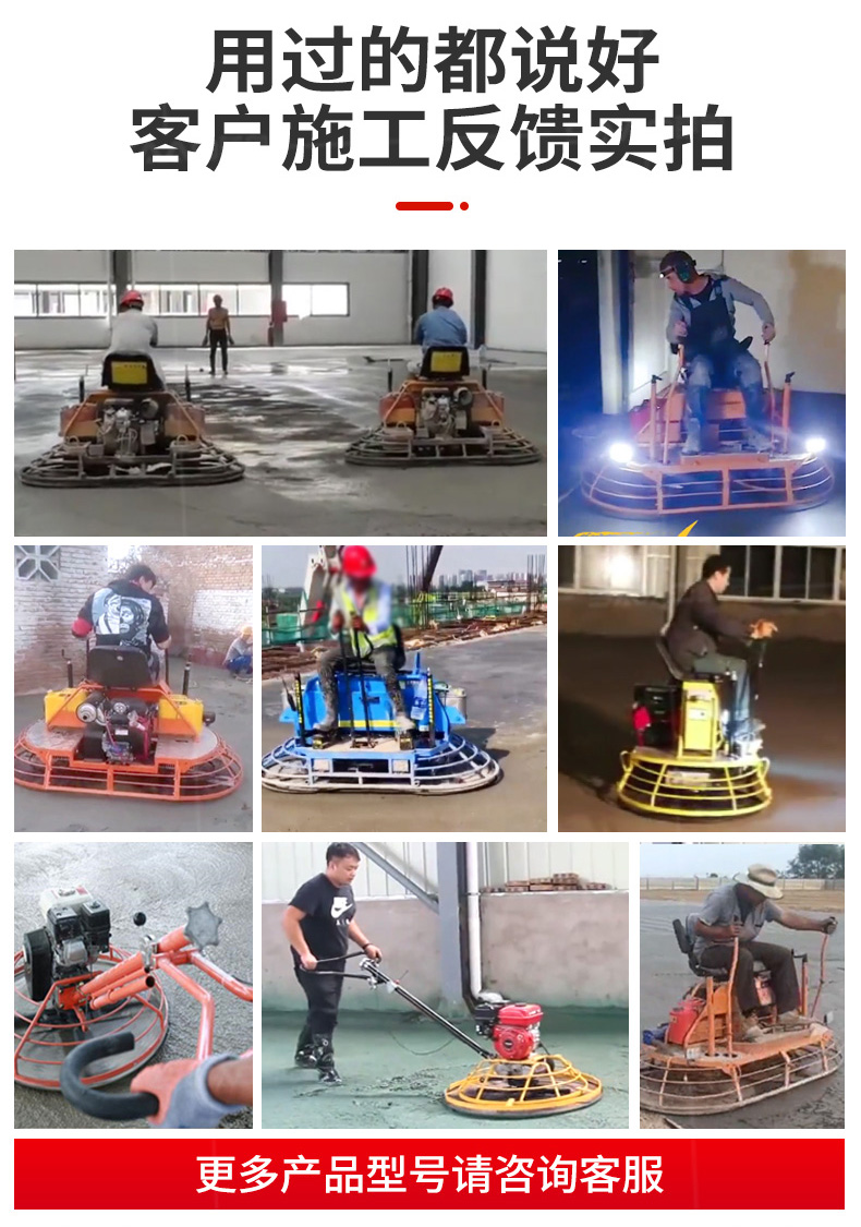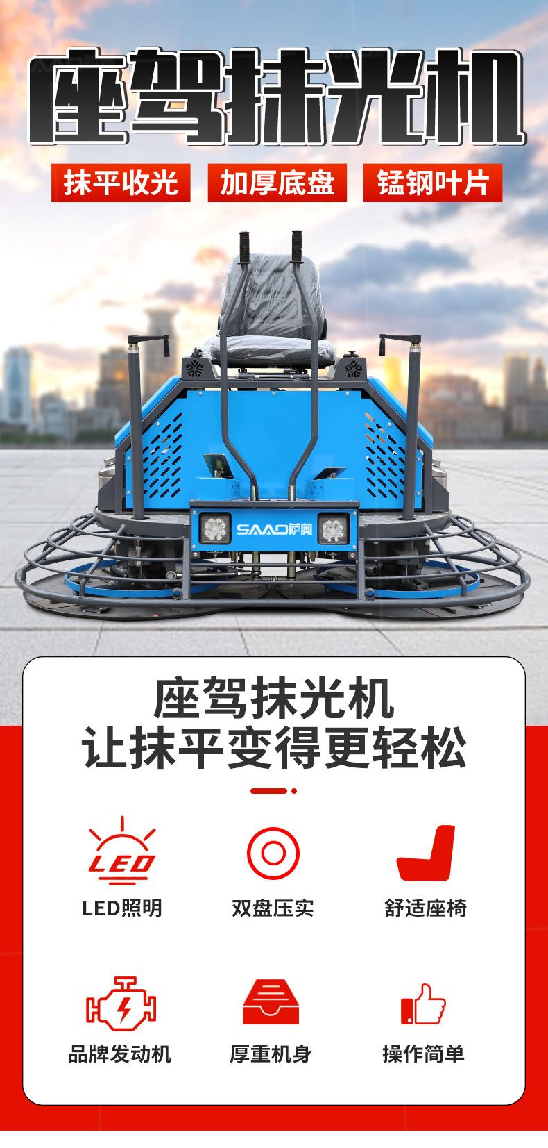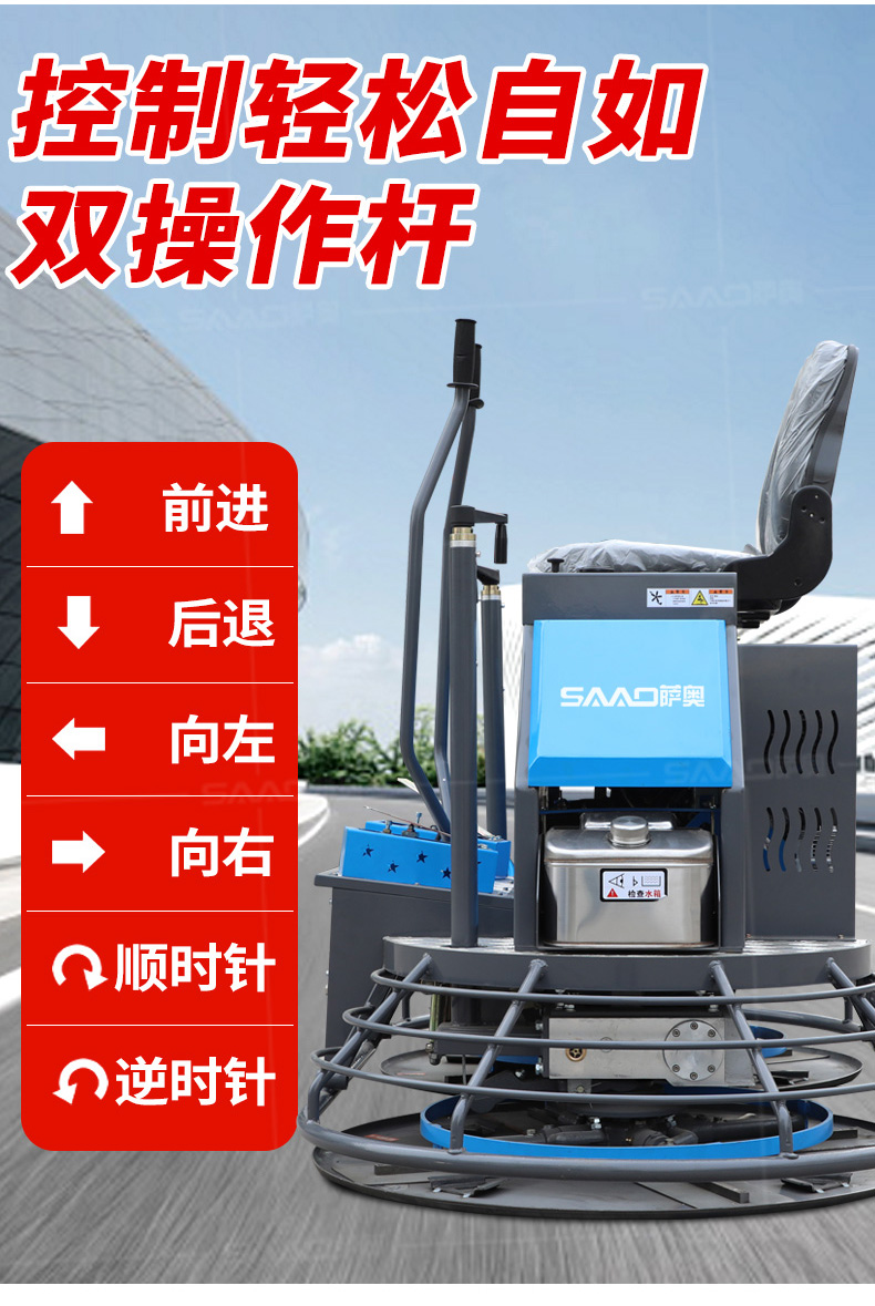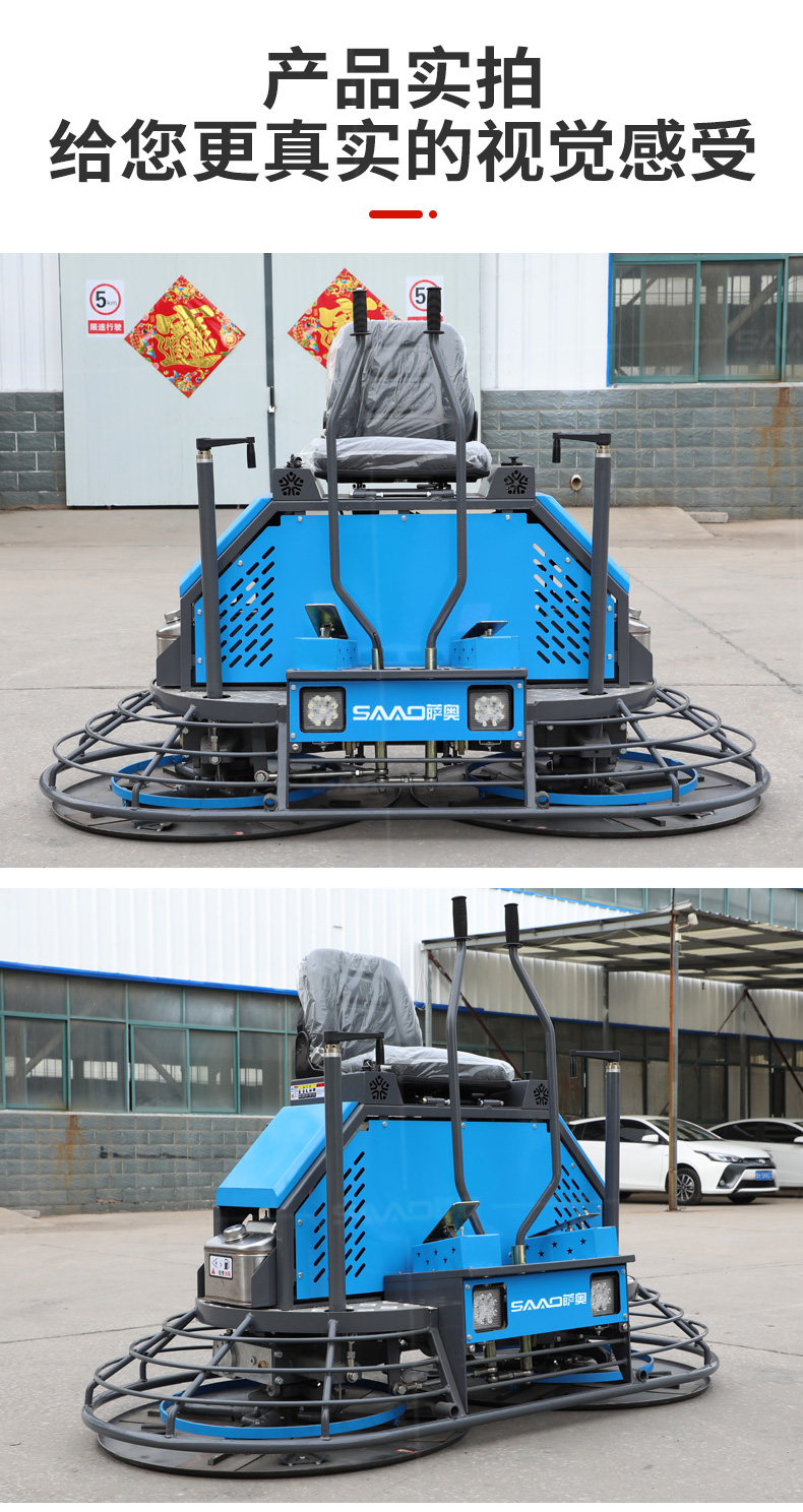 座駕式抹光機(jī)用于混凝土地面的提漿、壓實(shí)、抹平、抹光,座駕式操作大大降低了操作者勞動(dòng)強(qiáng)度,提高了作業(yè)效率。