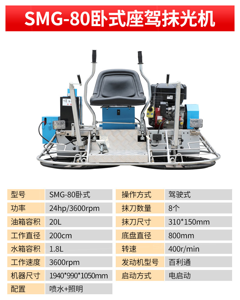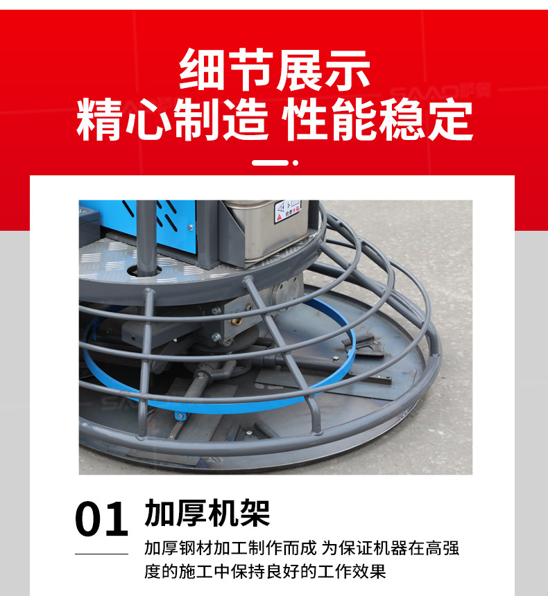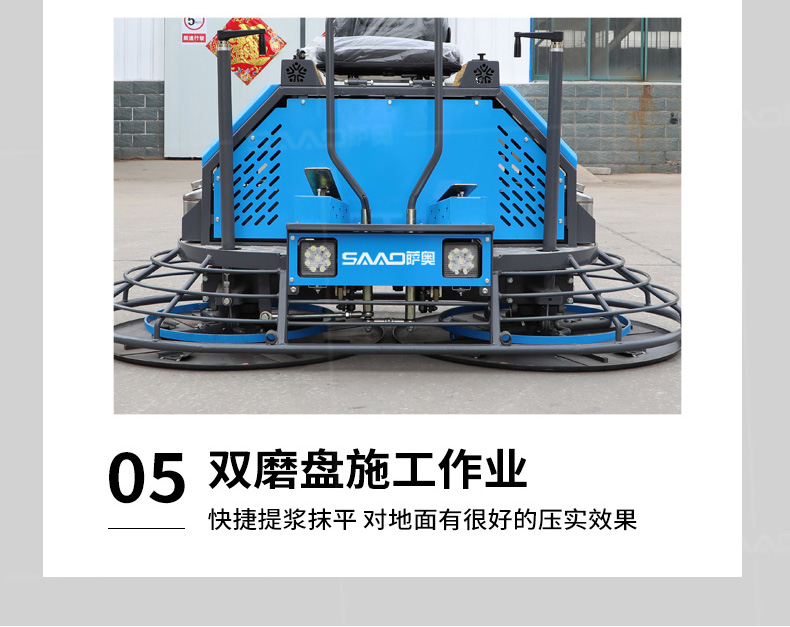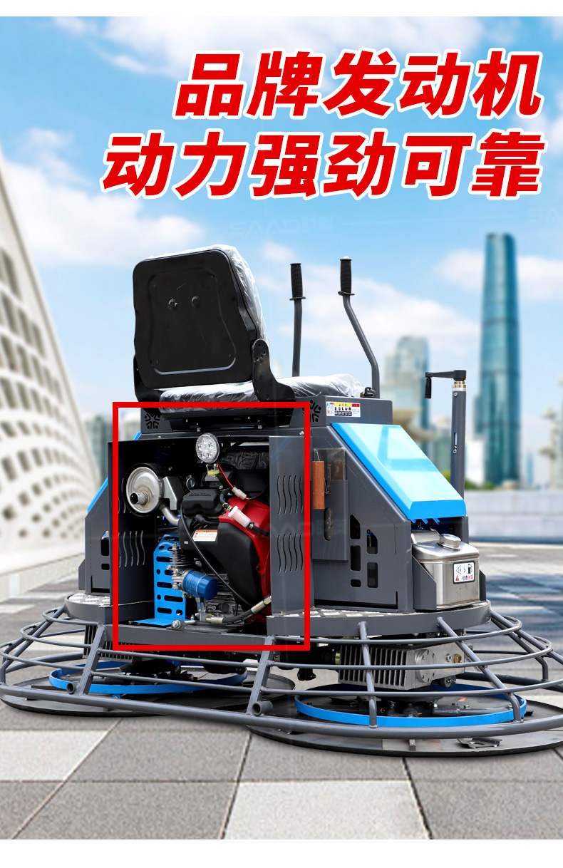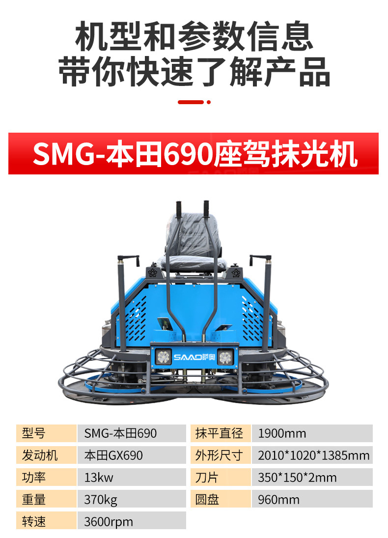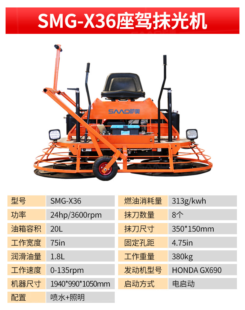 座駕式抹光機(jī)用于混凝土地面的提漿、壓實(shí)、抹平、抹光,座駕式操作大大降低了操作者勞動(dòng)強(qiáng)度,提高了作業(yè)效率。