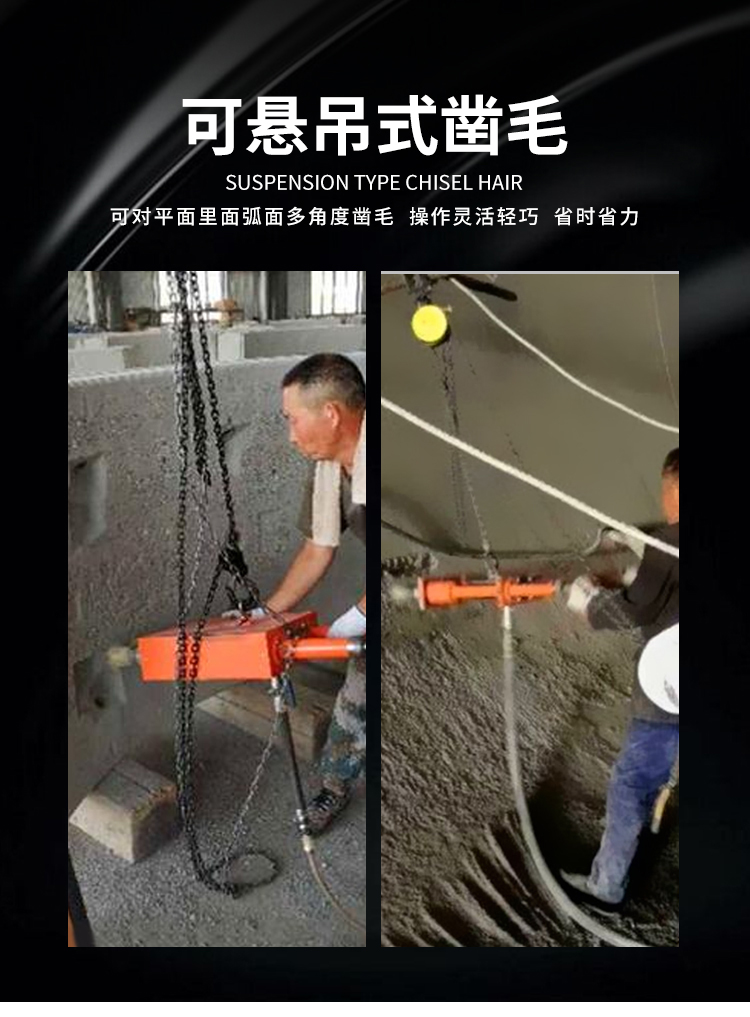 手持式懸掛鑿毛機機身有吊環(huán),鑿墻面的話吊起來使用,對平面、立面、弧形等多角度進行鑿毛作業(yè),打擊力大、鑿深自如,應用領域非常廣泛,又省力還方便。 主要適用于水庫、大壩