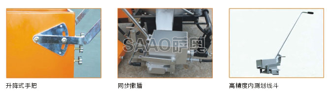 SAAO-320自走式熱熔劃線機采用德國最新的智能程序控制器和人性化控制面板,并配加進退自如的無級變速行走系統(tǒng),大大提高了施工效率,是熱熔標線施工的關鍵設備,同熱熔釜配合使用,完成標線施工,該機采用特殊制造的高精密度鑄鐵劃線斗,確保所劃標線邊齊,頭齊,厚薄均勻,線型美觀,落地刀能夠適應不同情況的路面.