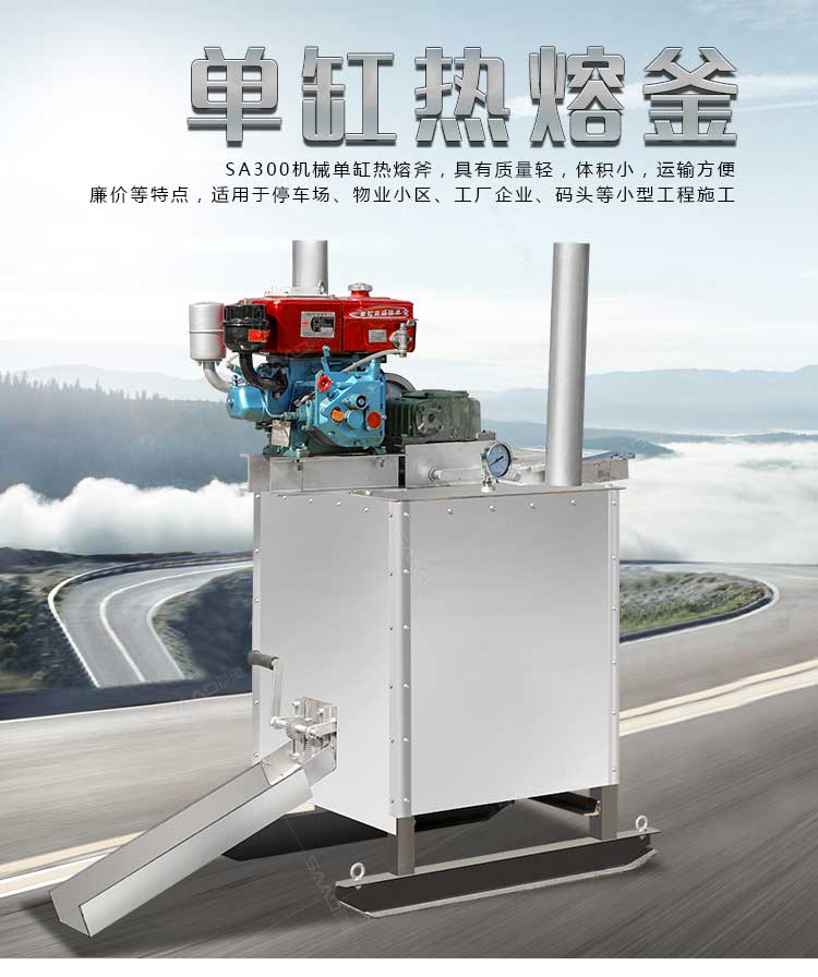 SA300機械單缸熱熔斧,具有質(zhì)量輕,體積小,運輸方便、廉價等特點,適用于停車場、物業(yè)小區(qū)、工廠企業(yè)、碼頭等小型工程施工。 產(chǎn)品參數(shù): 引擎:6.6PS柴油發(fā)動機 釜缸容量:350升缸