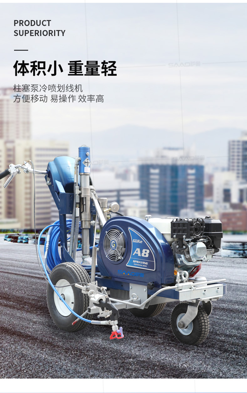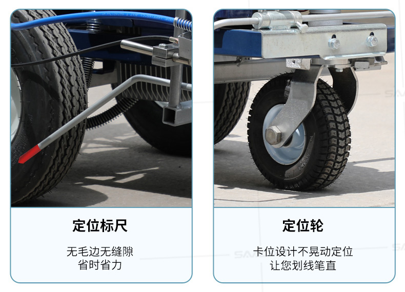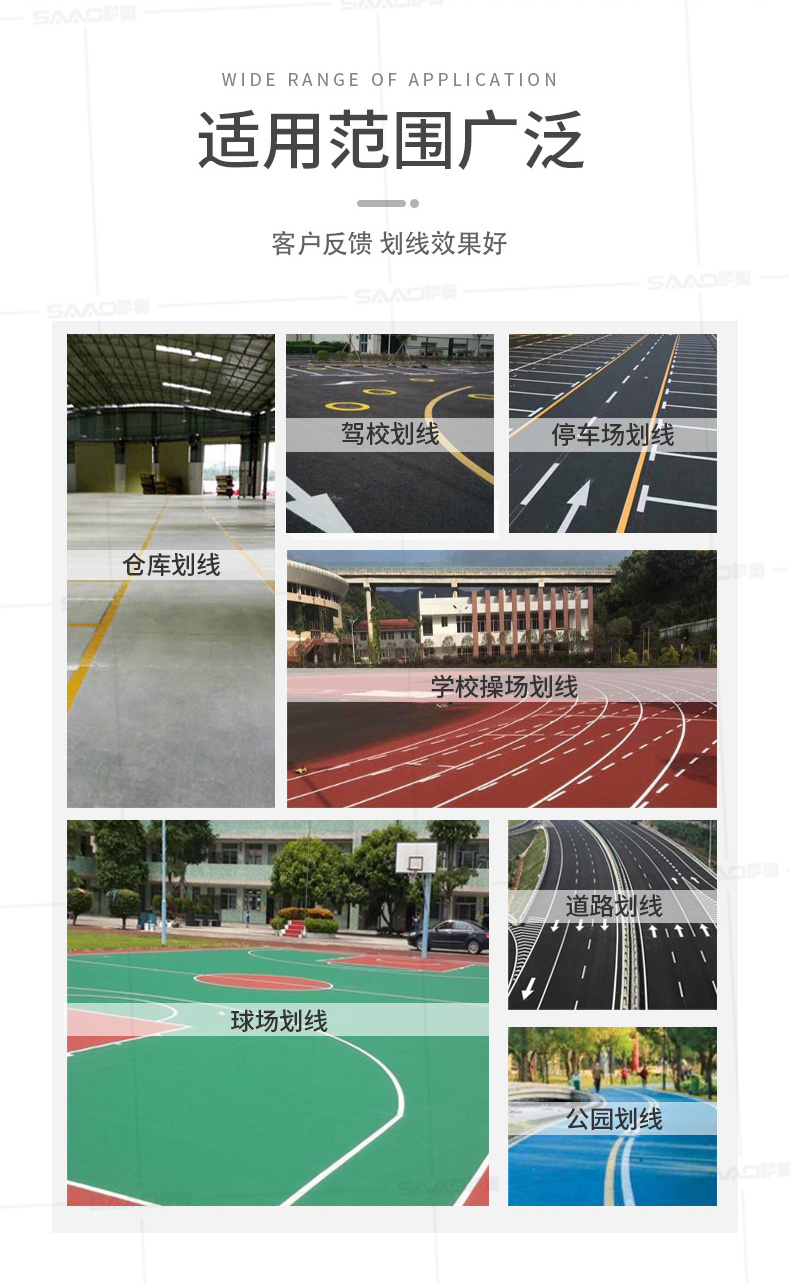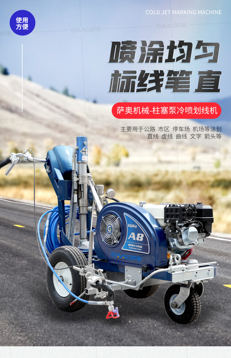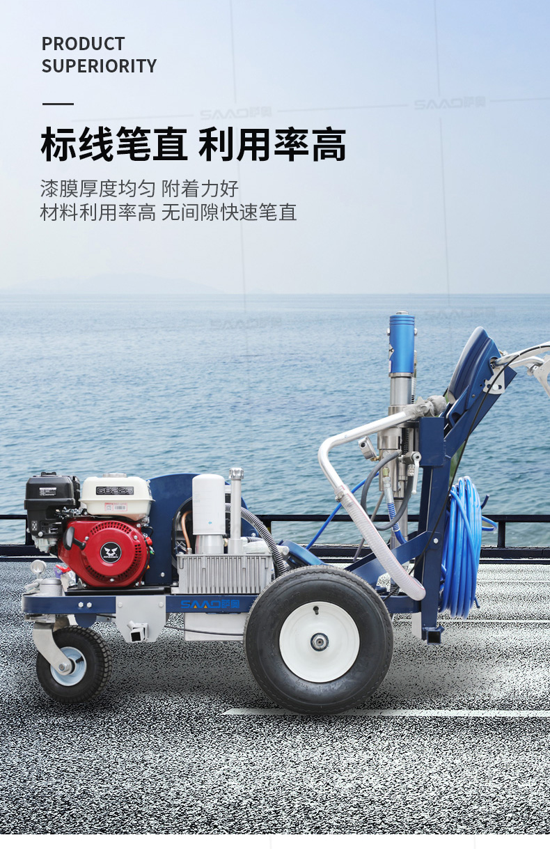主要用于公路、市區(qū)、停車場(chǎng)、機(jī)場(chǎng)等涂劃直線、虛線、曲線、文字、箭頭等。具有劃線效果好、速度快、效率高、適用范圍廣、使用方便等優(yōu)點(diǎn)。