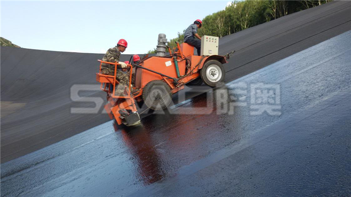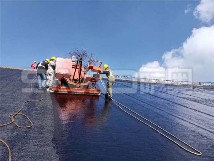 瀝青封閉層的施工采用適合于斜坡施工的專用瀝青瑪蹄脂涂刷機(jī),在牽引臺(tái)車的牽引下沿著面板從下往上涂刷。涂刷完一個(gè)條帶后,將涂刷機(jī)移動(dòng)至下一個(gè)條帶繼續(xù)涂刷?,斕阒忾]層涂刷作業(yè)時(shí)環(huán)境氣溫應(yīng)在10℃以上,涂刷溫度一般在170℃~190℃;施工完成的封閉層表面禁止無關(guān)人員和機(jī)械行走;特殊部位:壩頂及曲率半徑較小的圓弧斷,采用小型機(jī)械涂刷方式進(jìn)行機(jī)械涂刷進(jìn)行,環(huán)庫水平段及弧段全部采用小刮涂機(jī)配合人工進(jìn)行刮涂施工。