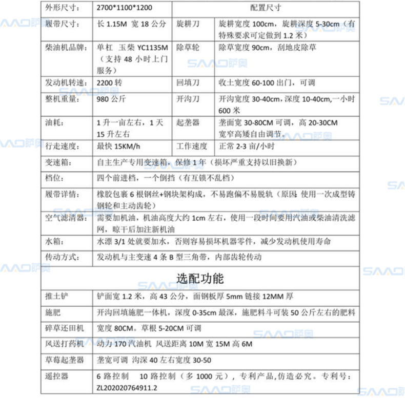 選配:推土鏟、施肥器、打藥機(jī)、碎草機(jī)等